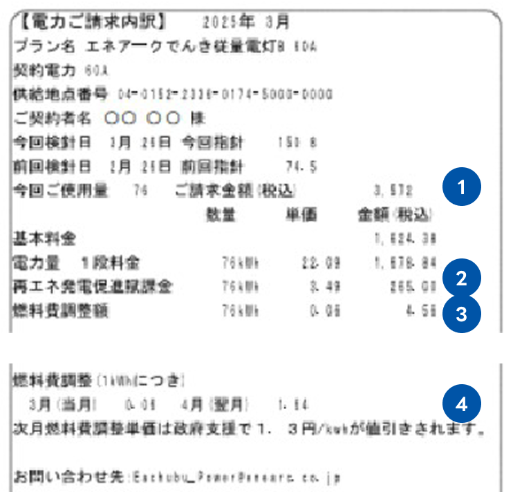 先⽉お使いいただいた電気の利⽤量および料⾦内訳です。