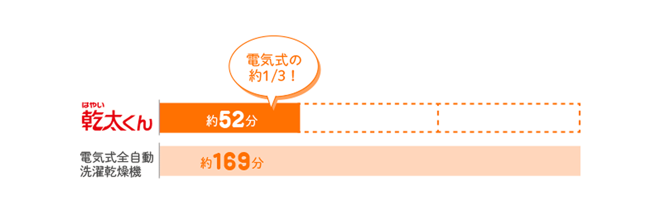 「洗濯機と乾太くん」と「全自動洗濯乾燥機」の乾燥時間の比較イメージ